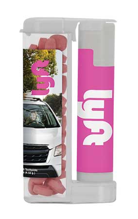This flip-top dispenser (SMNPPB-ZLBPWT) with sugar-free mints and lip balm is great, but the eye-catching full-color process label takes it to an entirely different level; snugzusa.com