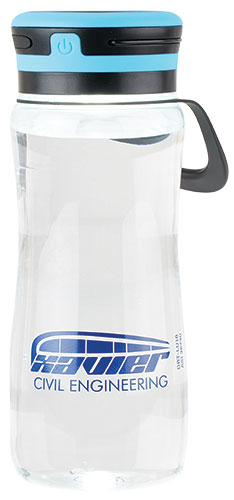 This 20 oz. Tritan bottle (DBT-LU18) includes a powerful three-level light in the lid. Charged with a cable or the built-in solar panel, it affords 10 hours of illumination; arielpremium.com